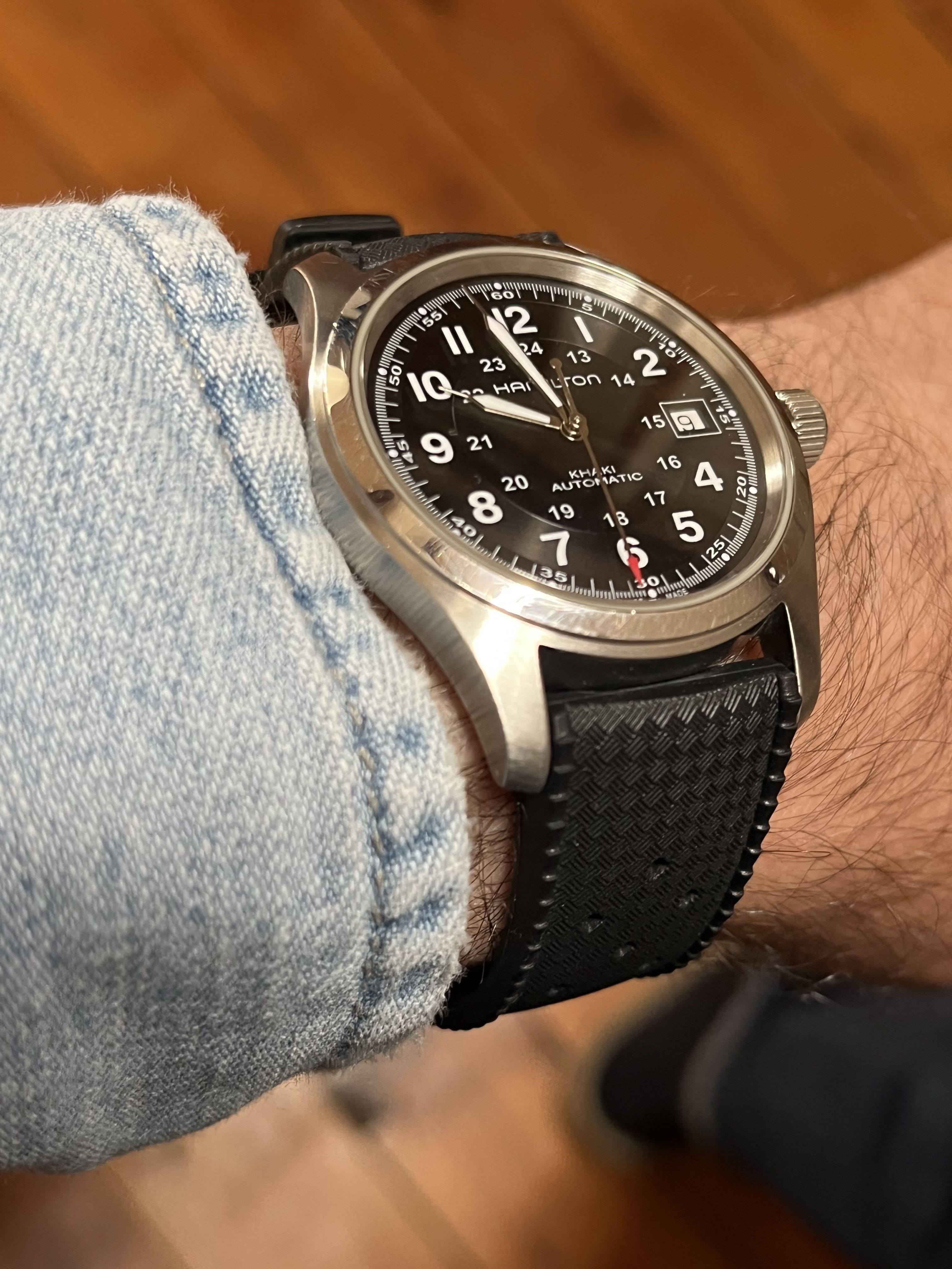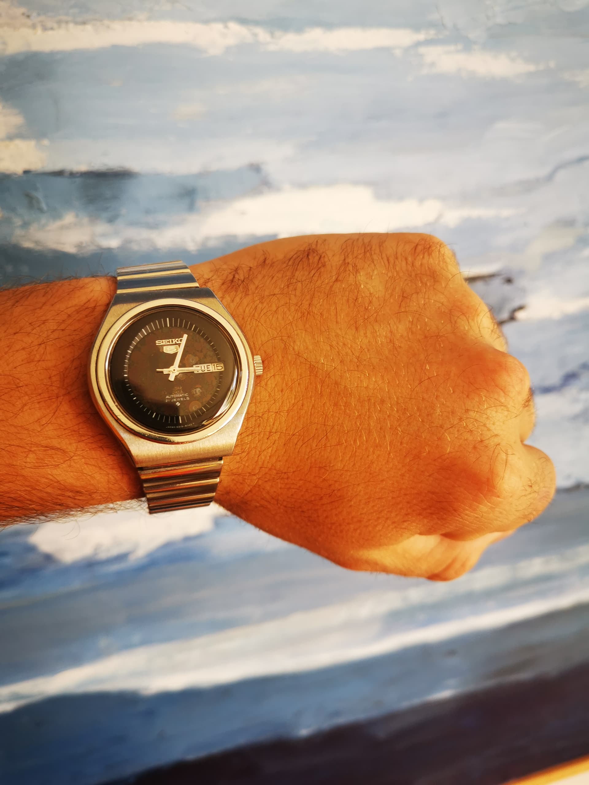 Seiko 5 des années 1970, avec une belle patine qui se révèle au soleil sur le fond du cadran (très difficile à prendre en photo)