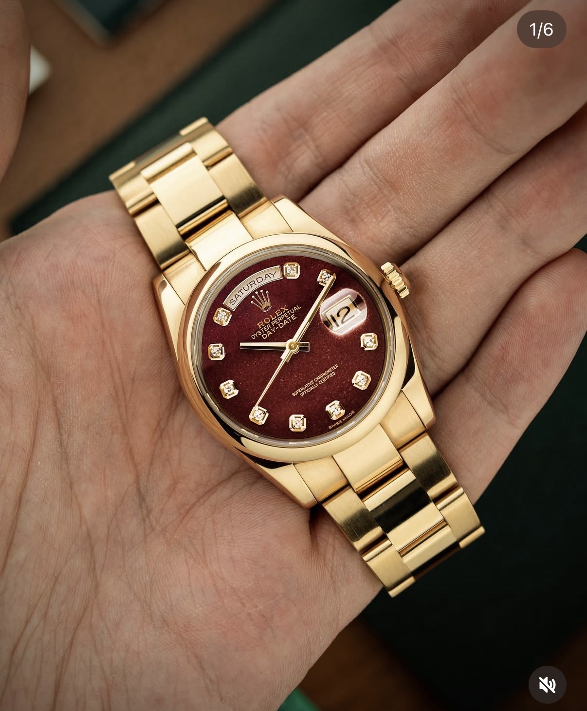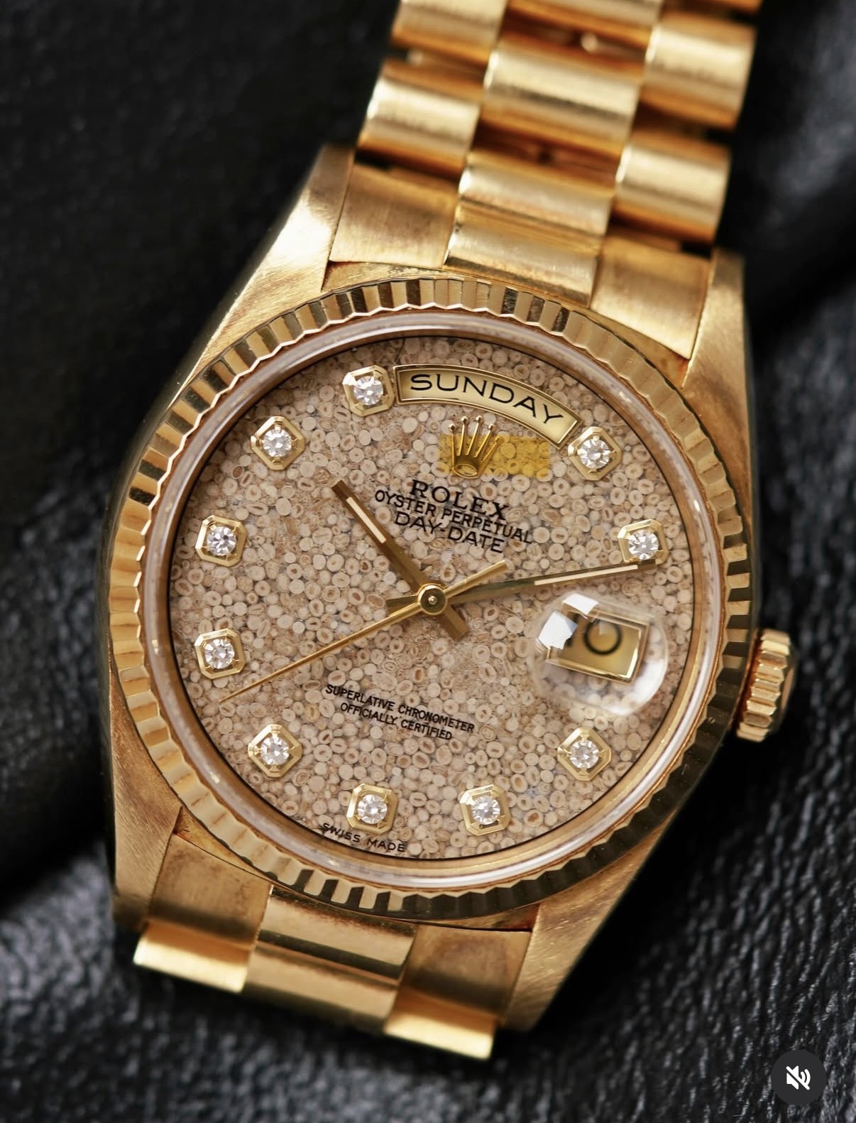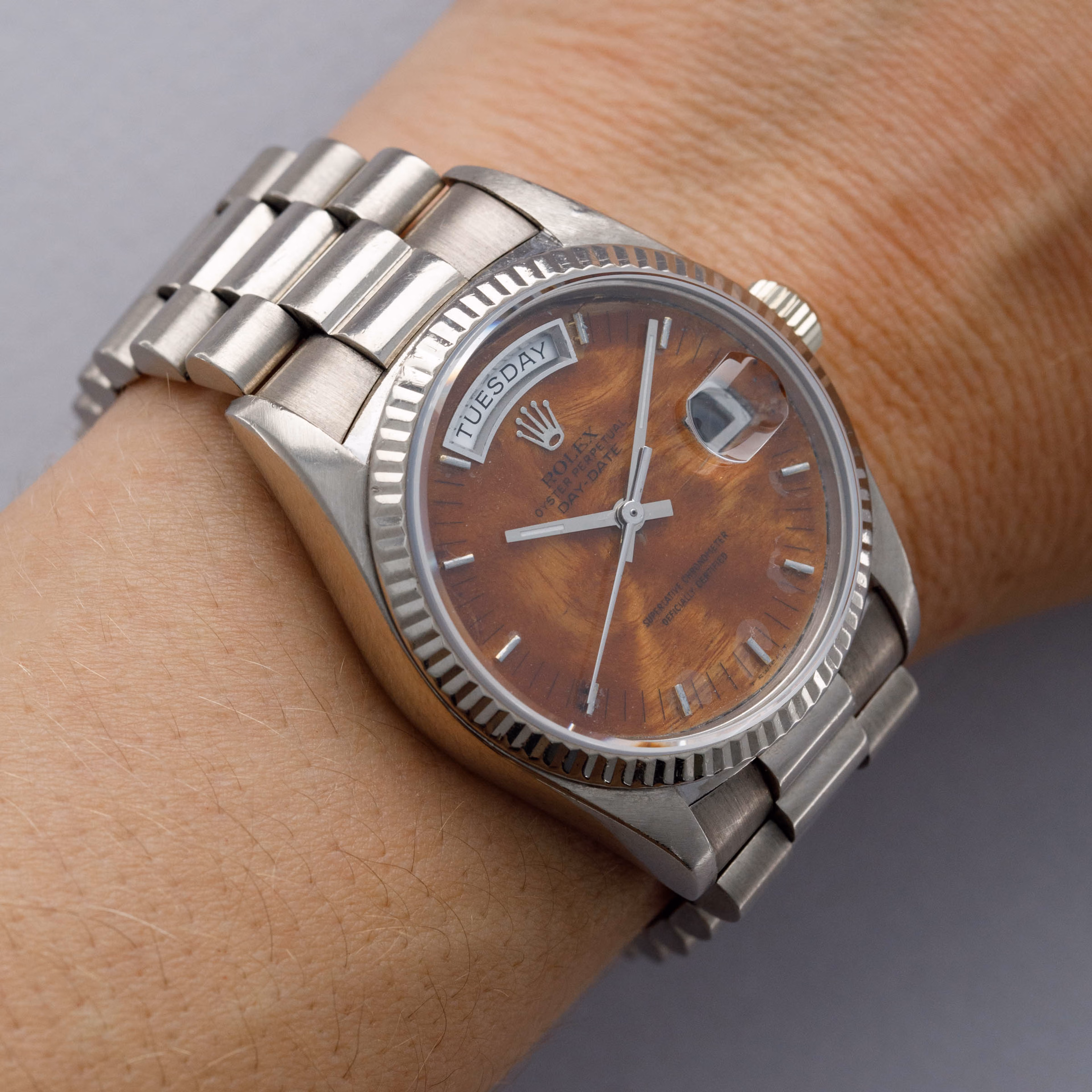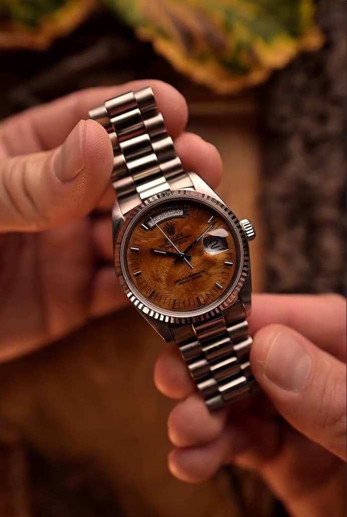 Par contre je suis tombé sur un modèle que je trouve vraiment fabuleux, mais vraiment. C’est une Day date 18039 avec une finition du cadran en bois. Je ne pensais pas trouver ce genre d’asso de matières chez cette marque. Peut être qu’il en existe d’autres car je ne connais pas suffisant les modèles, mais là wahouuuu :