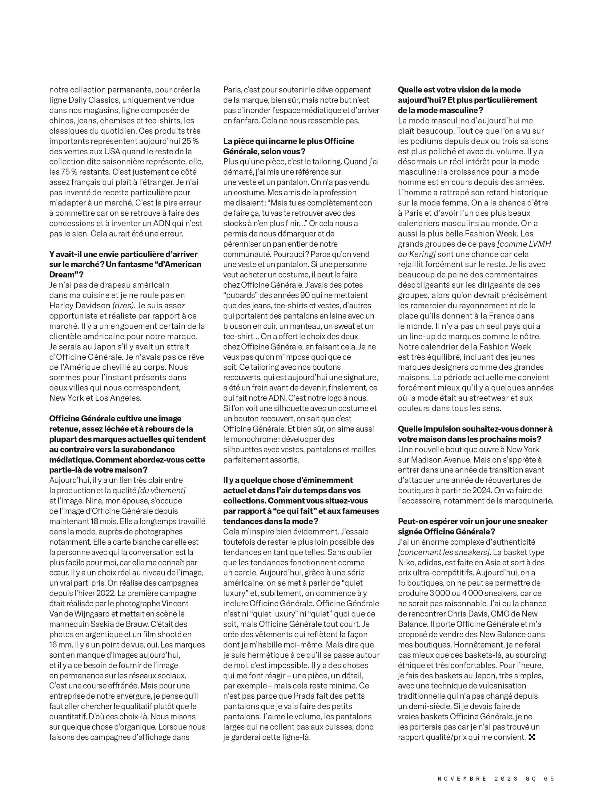 J’ai lu l’article de GQ. Là ou je ne suis pas d’accord c’est quand Pierre Maheo dit « Je serais au Japon s’il y avait un attrait d’Officine Générale (par rapport aux USA CQFD). Je pense que justement le prochain développement international d’OG passera par l’Asie. Article intéressant bien qu’un peu « lèche-culiste » quand il dit : " Les grands groupes de ce pays (LVMH, Kering…) sont une chance car cela rejaillit forcément sur le reste (il parle notamment de la Fashion Week à Paris). Je lis avec beaucoup de peine des commentaires désobligeants sur les dirigeants de ces groupes, alors qu’on devrait précisément les remercier du rayonnement et de la place qu’ils donnent à la France dans le monde »…