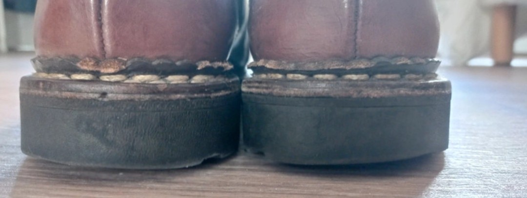 Semelles qui ont l’air dans un assez bon état, cuir un peu usé sur le dessus, forme pas démolie, arrière de la chaussure gauche avec un défaut sur la partie cousue.