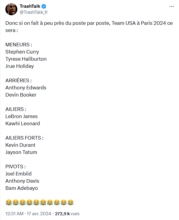 Je te rejoins dans le sens oĂč ce nâest pas lâĂ©quipe US qui me hype, mais plutĂŽt les Ă©quipes europĂ©ennes qui dĂ©passent la somme de leurs individualitĂ©s comme lâAllemagne ou la Serbie (sans Jokic) qui sont arrivĂ©es en finale de la derniĂšre coupe du monde en battant USA et Canada.