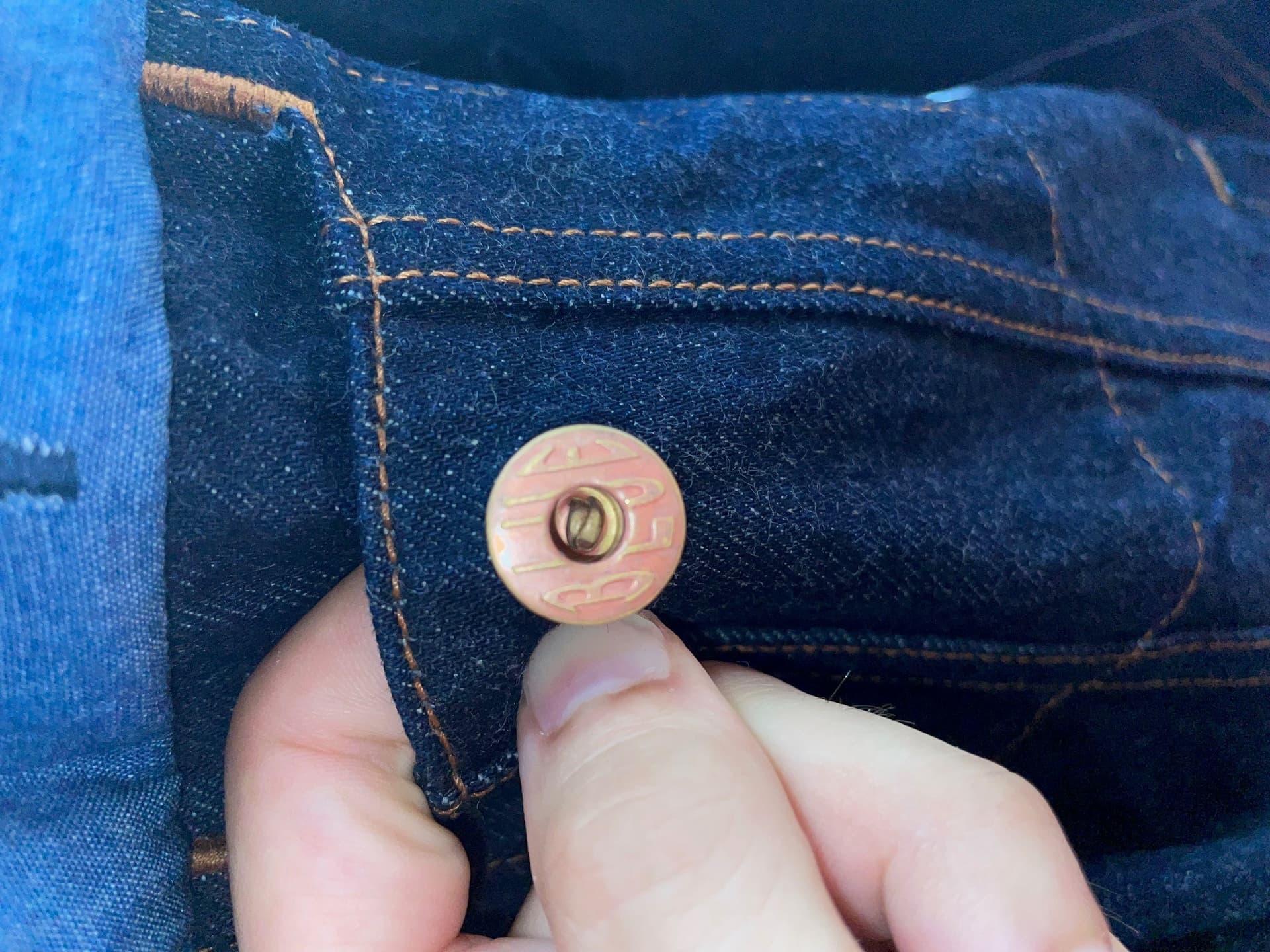 J’ai une Japan Blue Type 4 que j’aime beaucoup (achetée chez Monsieur Cam), mais je trouve les boutons un peu trop clairs (bronze). J’aimerais les noircir ou les oxyder pour un rendu plus vintage (type trucker levis). J’ai mis du sel et du vinaigre sur un bouton caché pour tester, mais j’ai l’impression que ça a dissout la patine initiale du cuivre, et est ressorti rosé/un peu plus cuivre naturel.