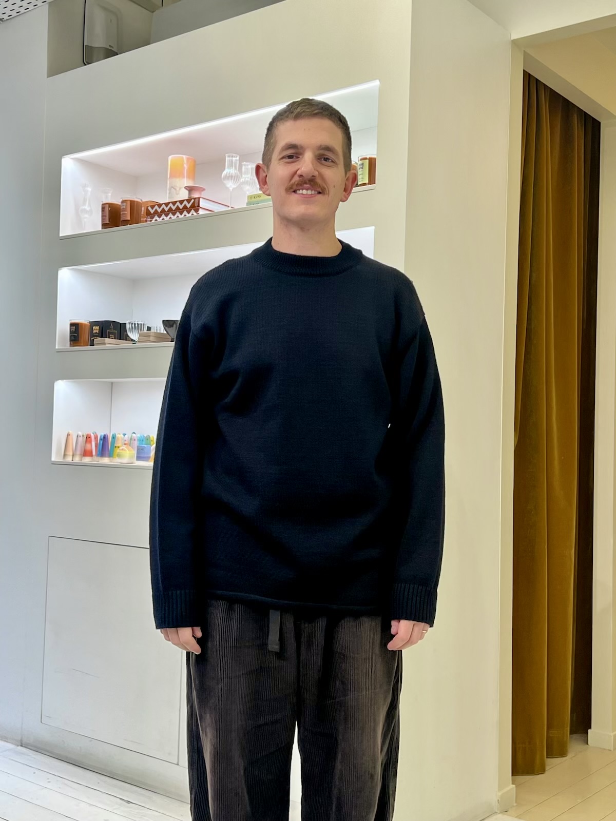 J’ai également essayé un pull en écru en M mais j’étais tellement boudiné que c’était ridicule. Le bas était notamment beaucoup trop resserré. Ça m’a gavé et je n’ai pas demandé la taille du dessus car je savais que ça ne donnerait rien.
