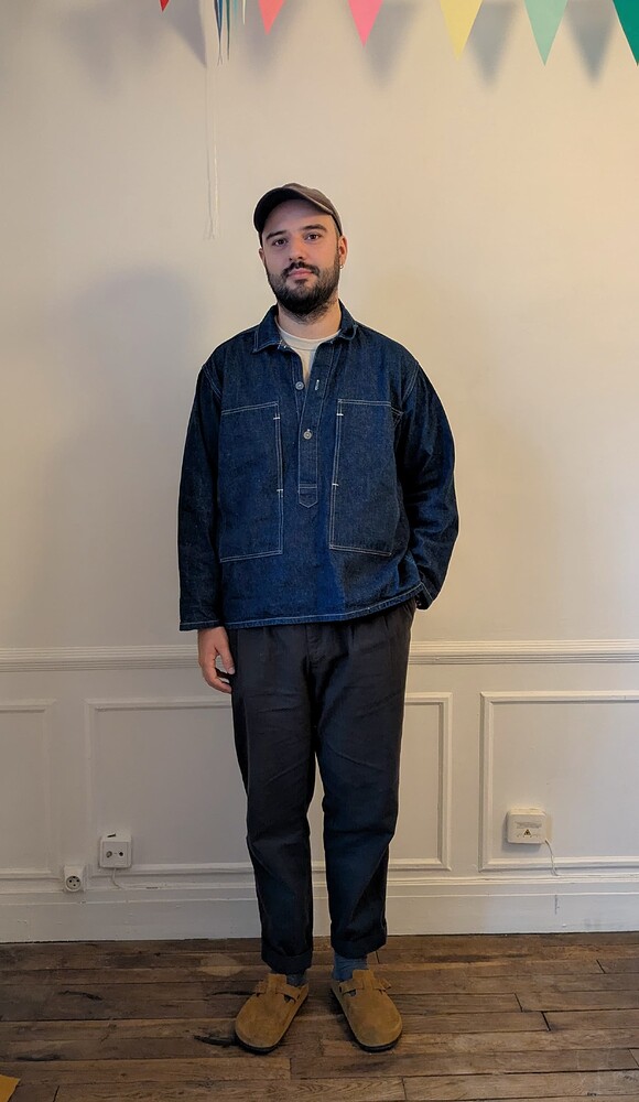Denim bien lourd 14oz, vraiment, jâaime beaucoup cette chemise et la finition avec les rivets et le liserĂ© selvedge sont cools.