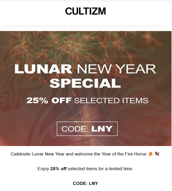 25% sur Cultizm avec le code LNY: Lunar New Year Special