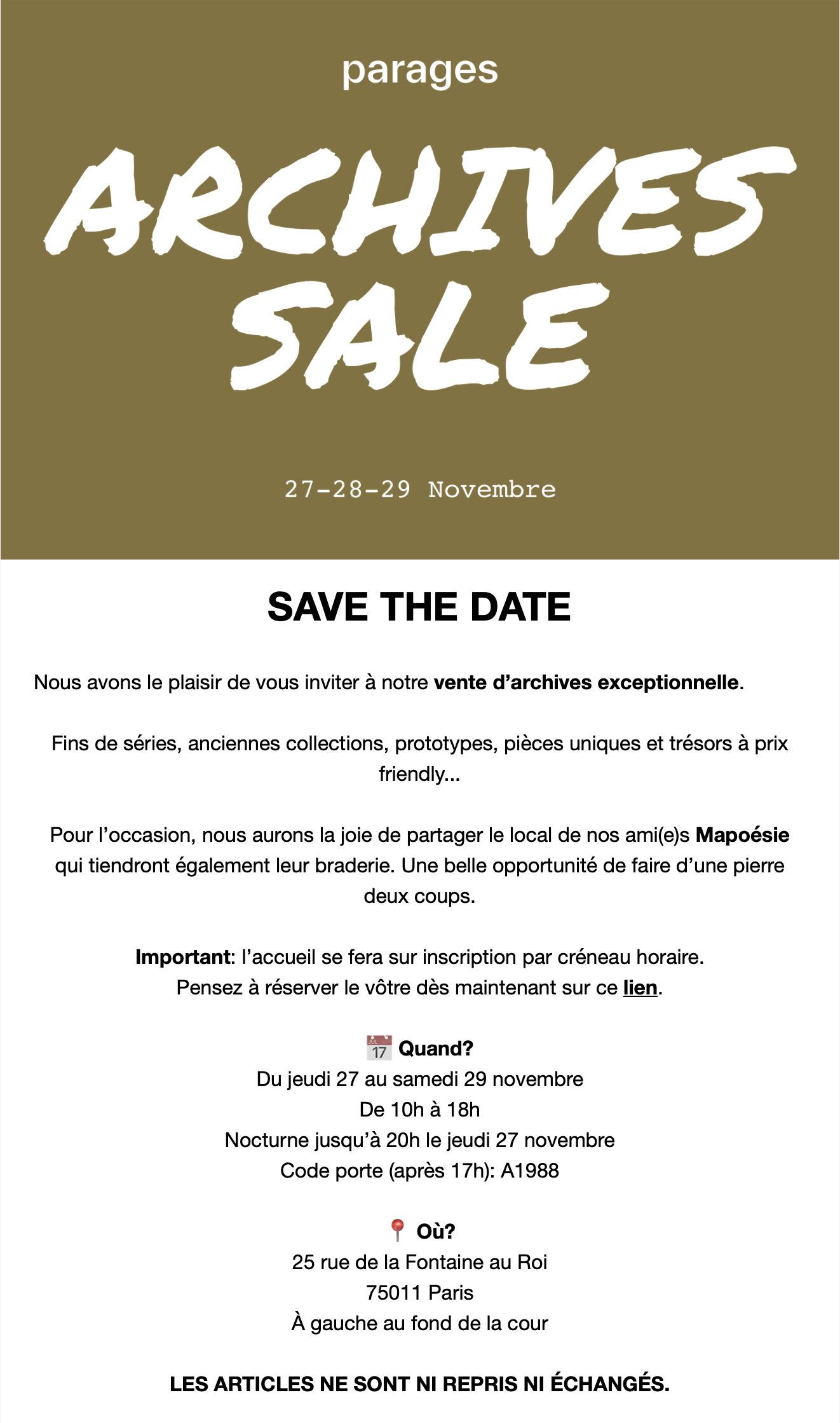 La saison des ventes dâarchives commençant Ă battre son plein, outre DbF, Officine GĂ©nĂ©rale, etc., jâai aussi reçu ce message de la marque Parages, pour ceux que cela pourrait intĂ©resser.