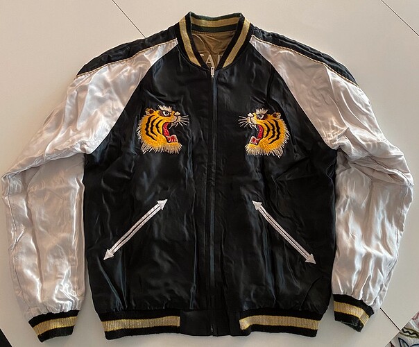 Sukajan Tailor Toyo (Toyo Entreprise donc Sugar Cane, Buzz Rickson, Sun Surf etc…), excellent prix. Taille petit donc ce XL est sûrement plus proche d’un petit L. J’en ai eu deux que j’ai revendues car trop petite. Super qualité.
