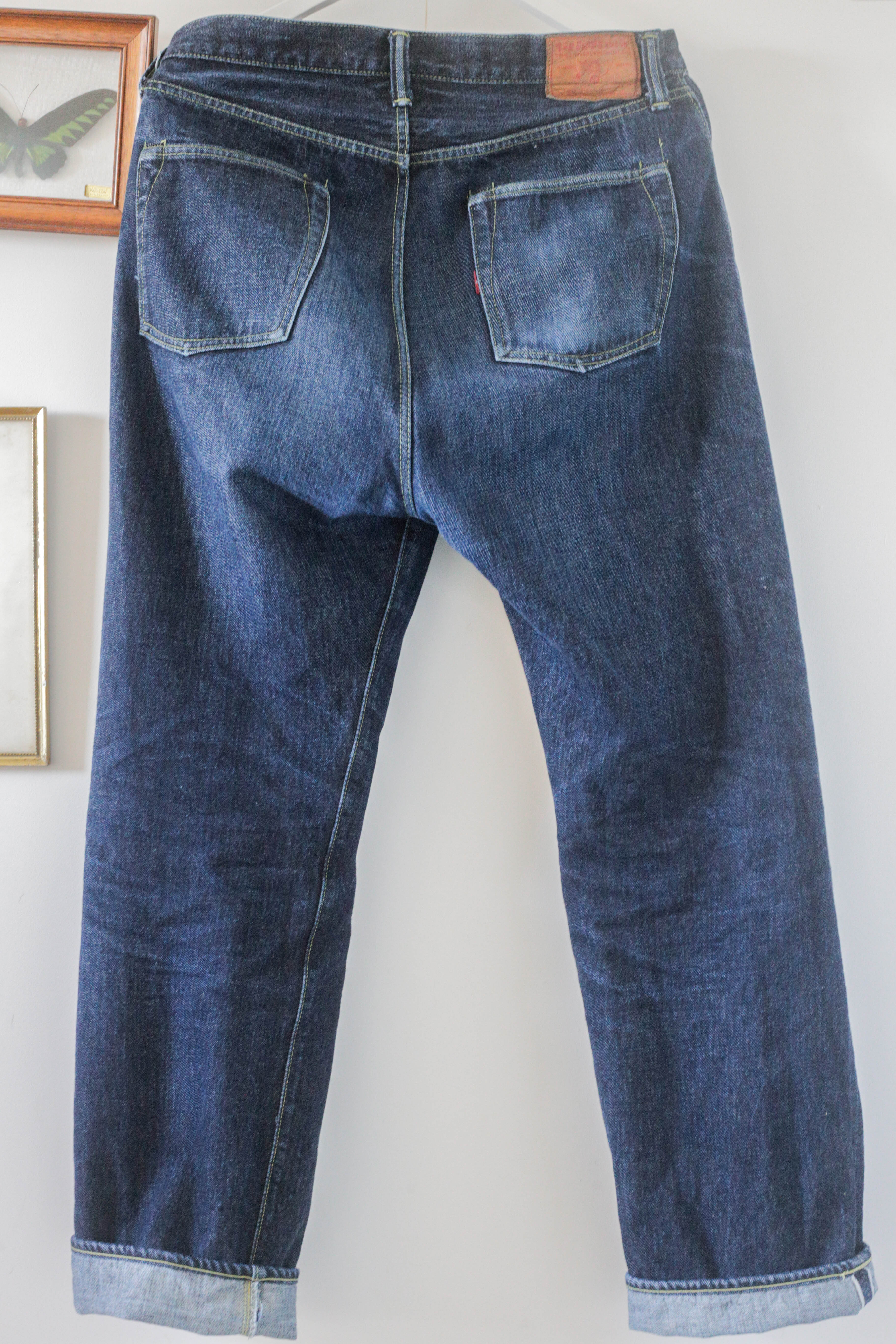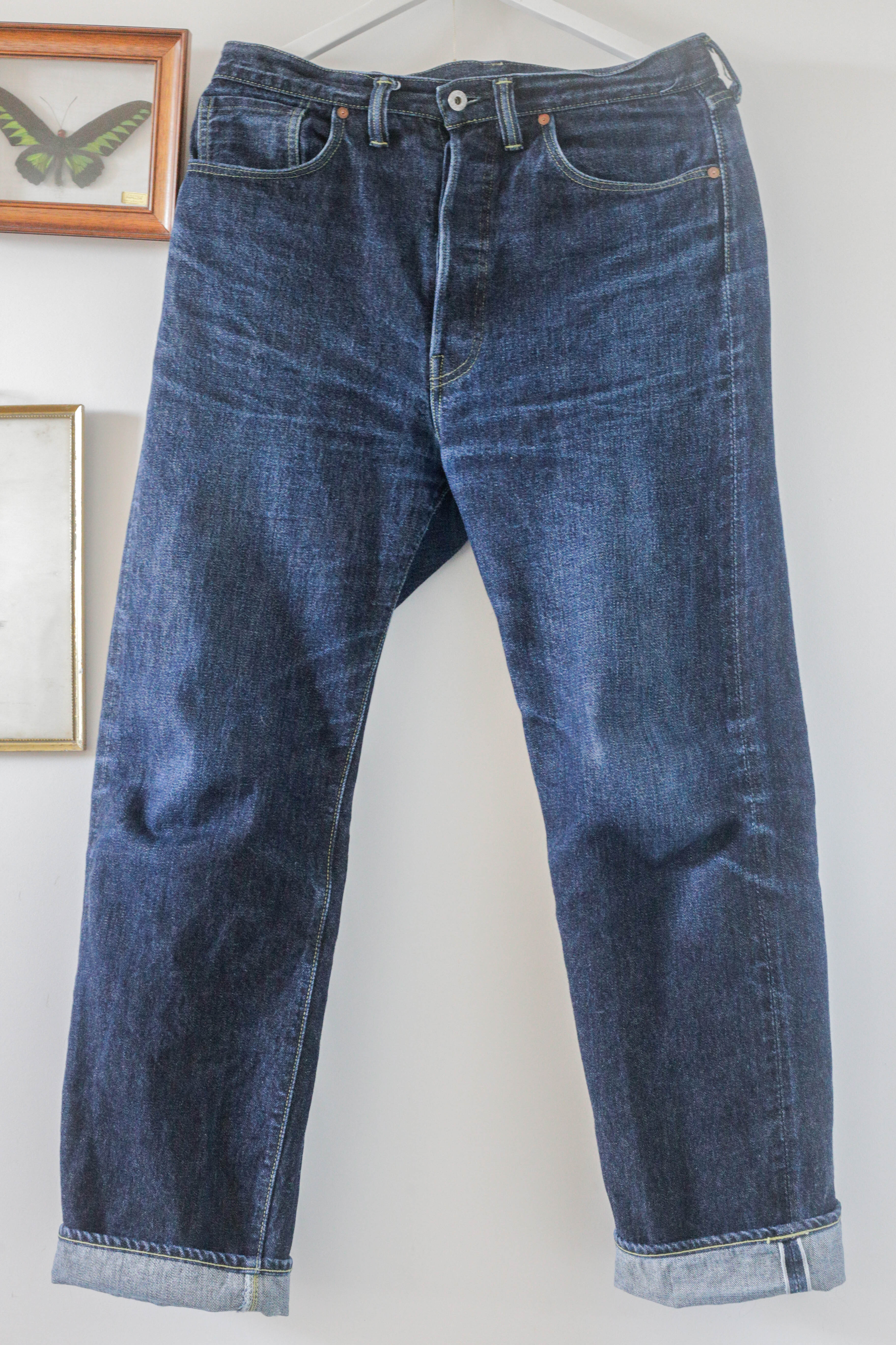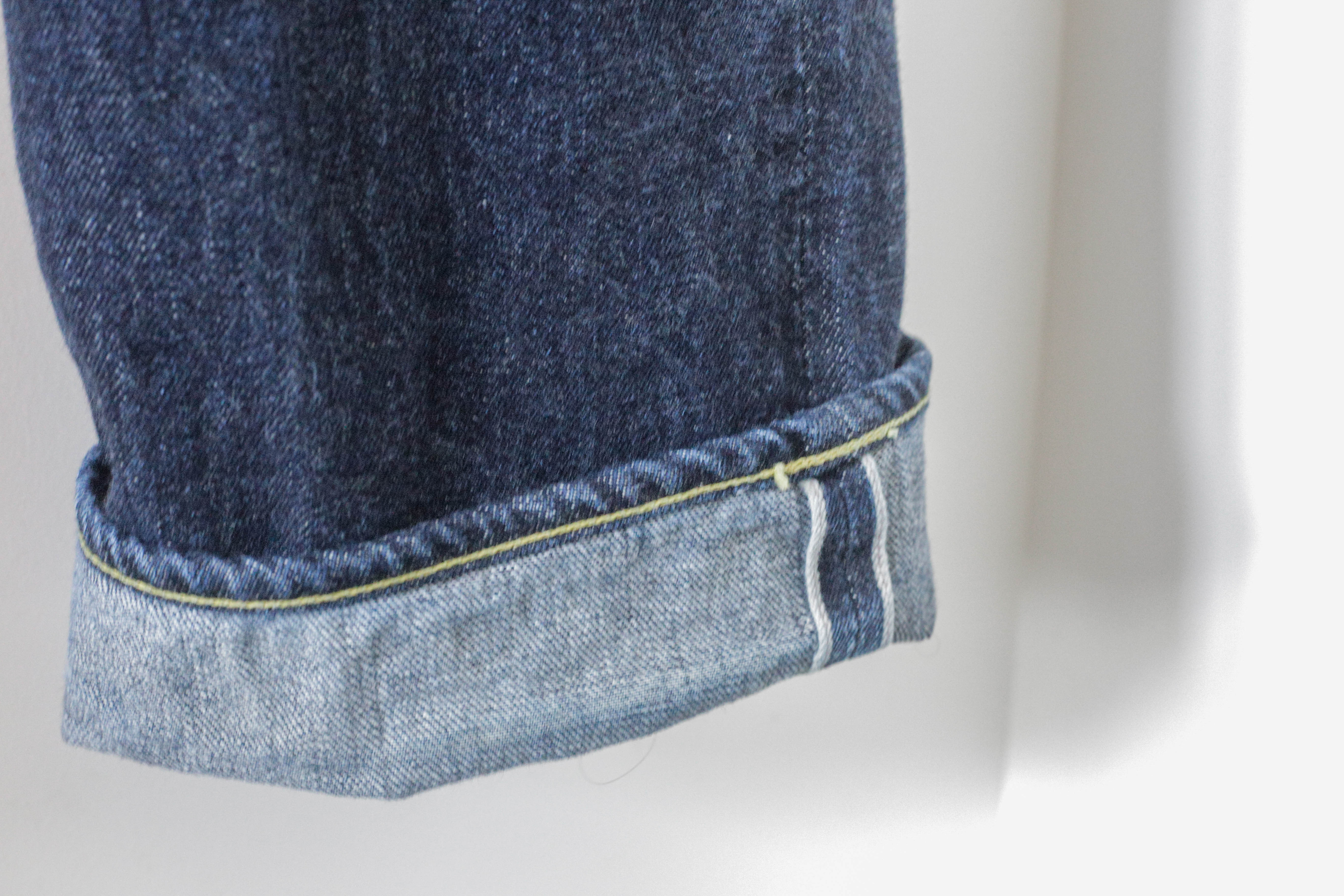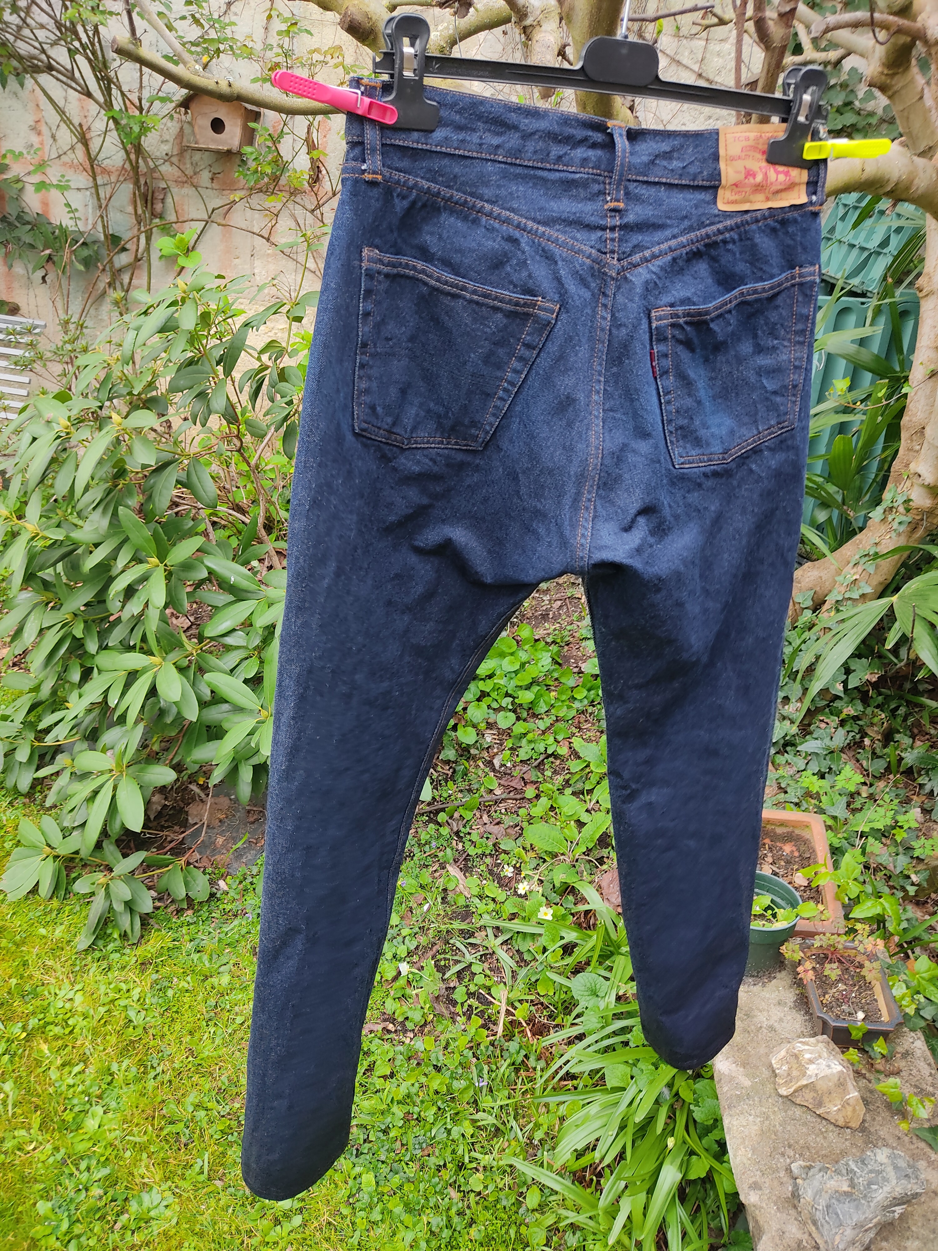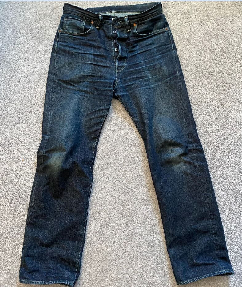 Après tout je crois que c’est un modèle qu’on voit moins. Je l’ai chopper en seconde main et son précédent propriétaire a déjà fait un lavage en machine avec la lessive de SuperStitch mais j’ai préféré repartir sur un lavage à la main pour le moment. Je repasserais sur un lavage en machine plus tard . Ah il a aussi eu droit à un soak a l’eau froide pour pouvoir étirer un peu la fourche et la taille a la main qui était un peu étroites sinon.