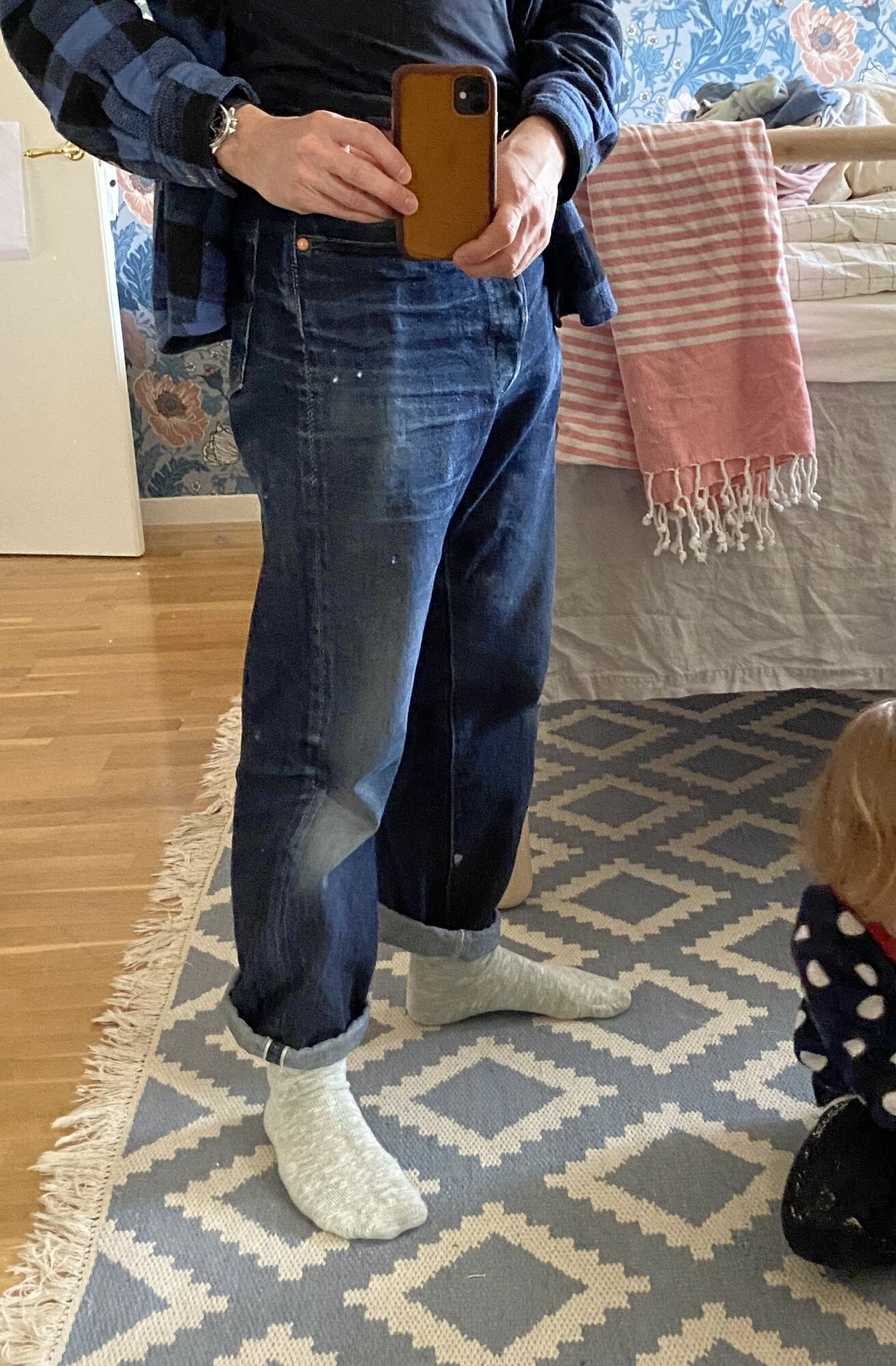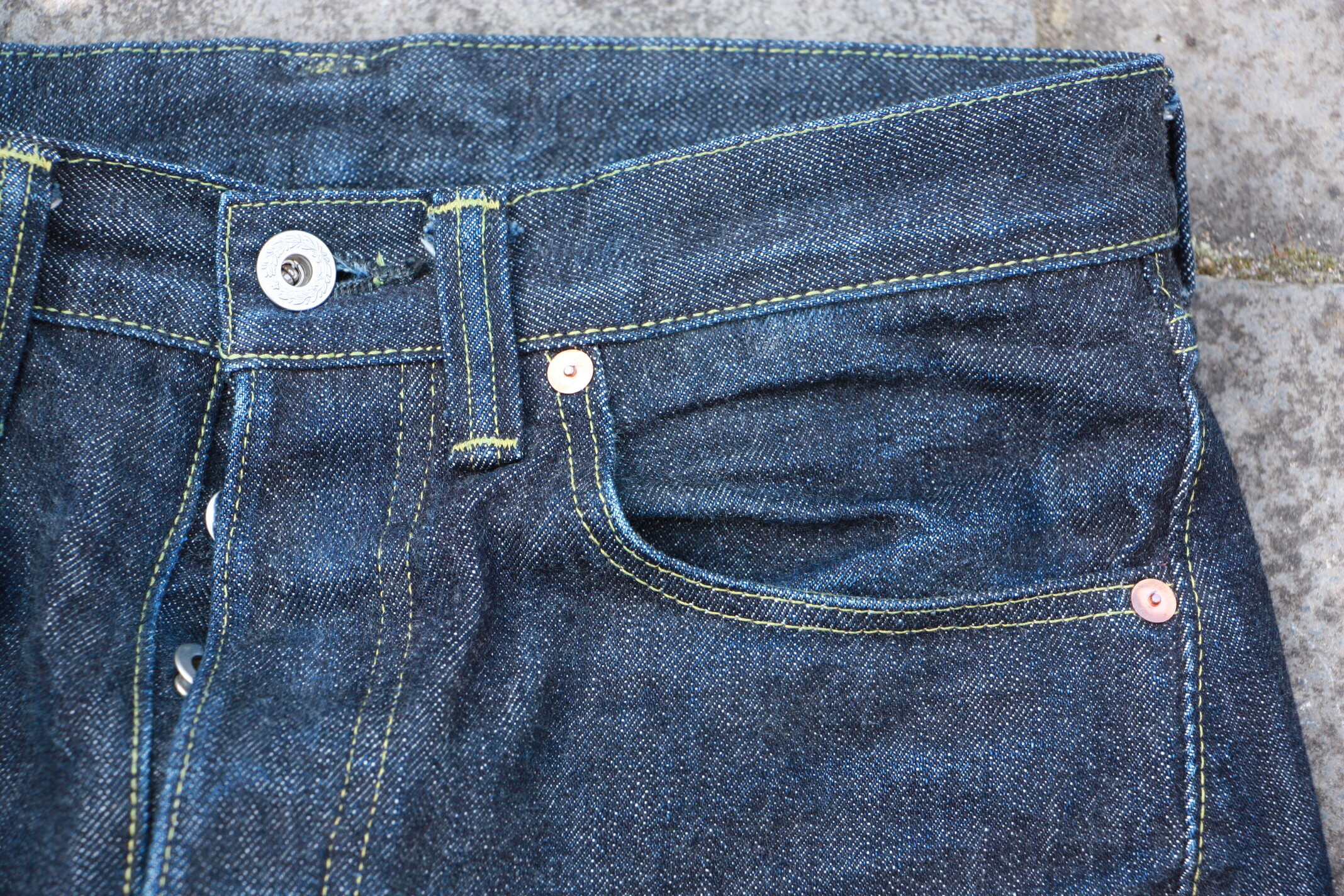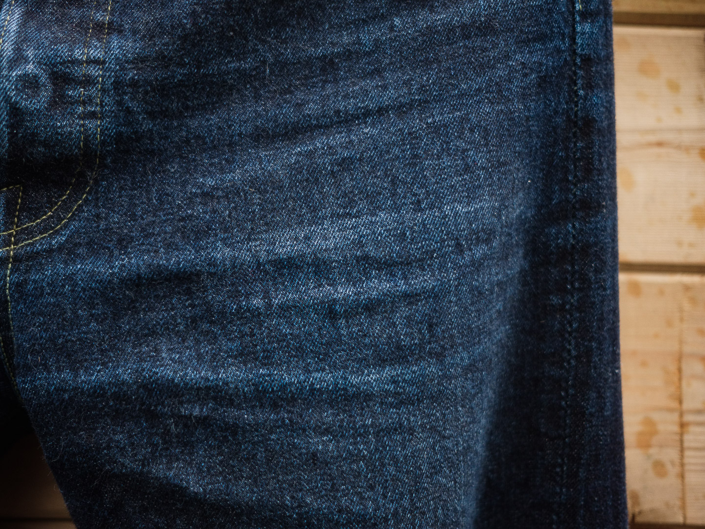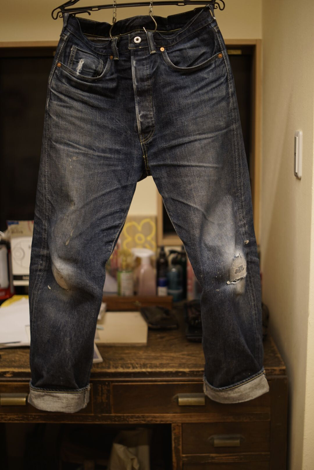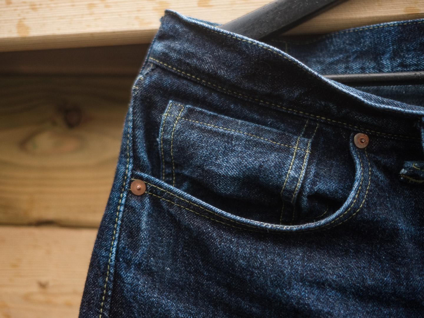 Après tout je crois que c’est un modèle qu’on voit moins. Je l’ai chopper en seconde main et son précédent propriétaire a déjà fait un lavage en machine avec la lessive de SuperStitch mais j’ai préféré repartir sur un lavage à la main pour le moment. Je repasserais sur un lavage en machine plus tard . Ah il a aussi eu droit à un soak a l’eau froide pour pouvoir étirer un peu la fourche et la taille a la main qui était un peu étroites sinon.