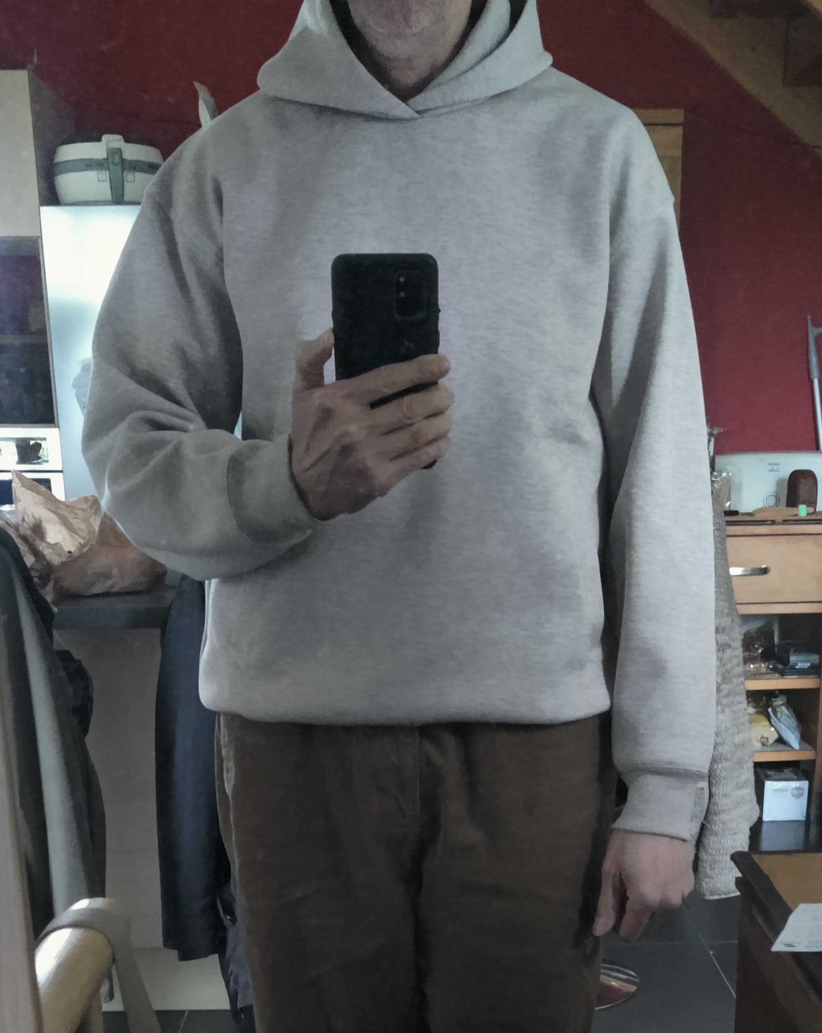 Ce n’est pas si oversize que ça. Forcément avec 8kg de plus sur la balance, je remplis un peu plus mes fringues mais ça reste loose fit. Je le porterai bord côte replié. Compo full plastique pas génial. Ça fait le job en attendant de trouver une alternative plus quali.