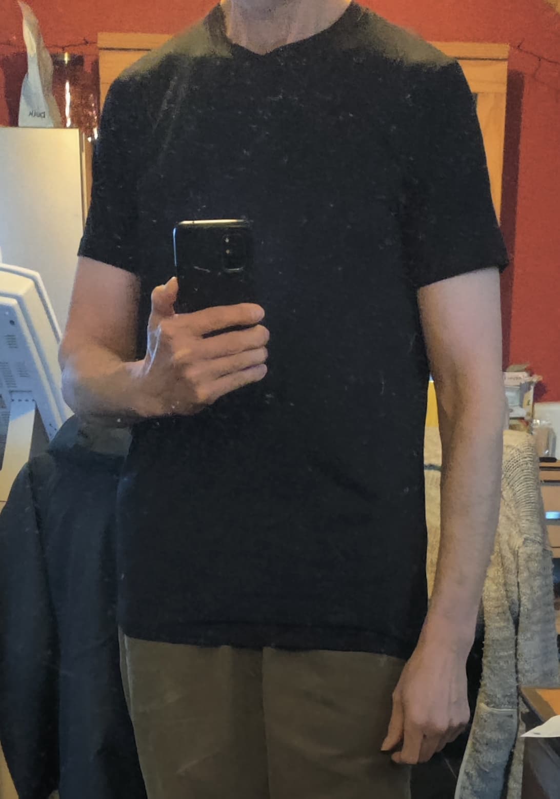 Une bonne longueur qui m’assurera de ne pas avoir le dos à l’air une fois rentré dans le pantalon. C’est agréable au touché, près du corps sans être trop collant et le col n’est pas trop serré. En M j’aurais été gêné à l’encolure. Parfait comme sous vêtement. À voir ce que ça donnera dans la durée.